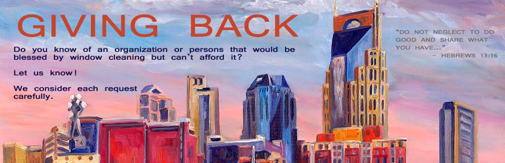 We are so excited and ready to help our community by giving window cleaning on a regular basis to those in need. Help us find them by calling when you know someone close that has a need. ie.. an orphanage with a low budget, a homeless shelter, a family member or friend that just suffered a fire with no insurance, the list could go on and on. We need your eyes and ears to pin point the need, and we'll help when we can. We will consider each suggestion very carefully and we're proud to be helping our community with people like you.